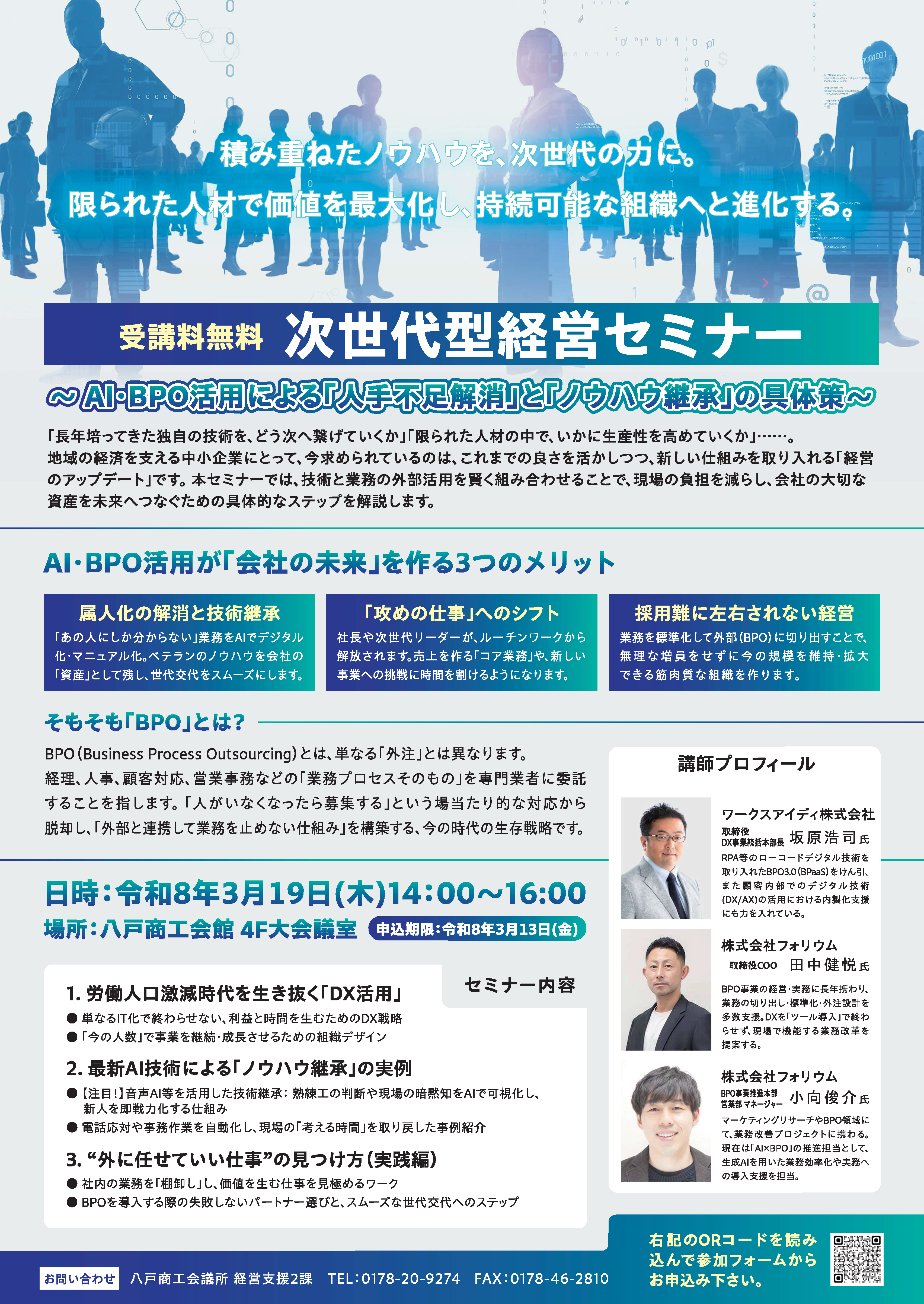 八戸商工会議所主催「次世代型経営セミナー ~AI・BPO活用による人手不足解消とノウハウ継承の具体策を解説~」に弊社取締役 坂原が登壇いたします